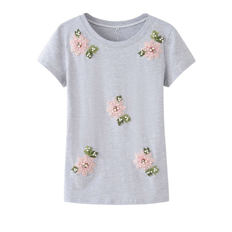 Dámske tričko s krátkym rukávom a okrúhlym výstrihom. Príjemný materiál. Tričko je pošité kvetmi a perličkami. Dostupné v niekoľkých farbách.
