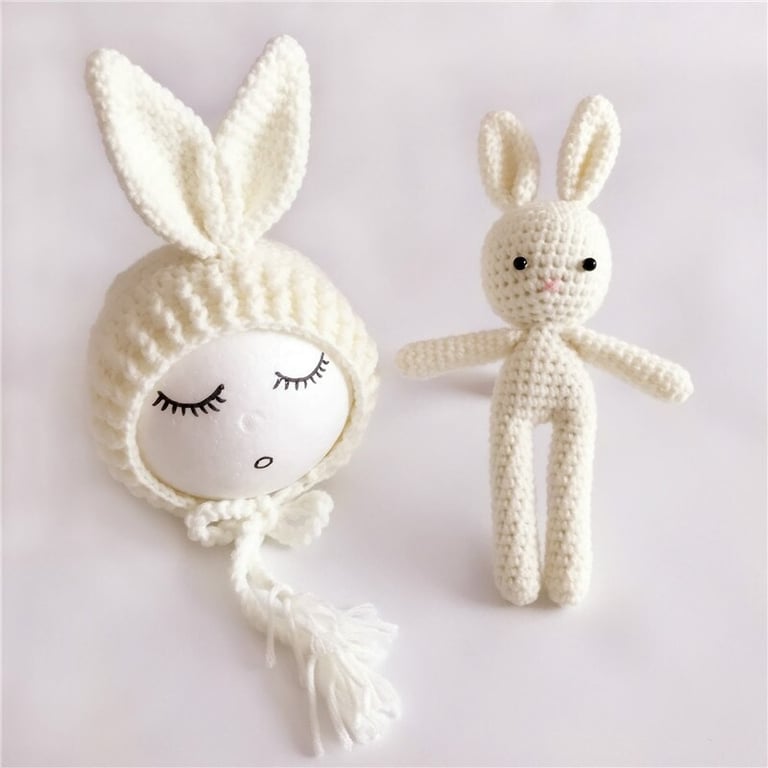Roztomilý detský set - pletená čiapka s ušami a zajačik v rovnakej farbe.
