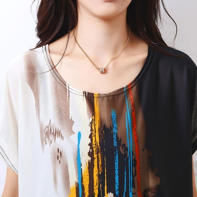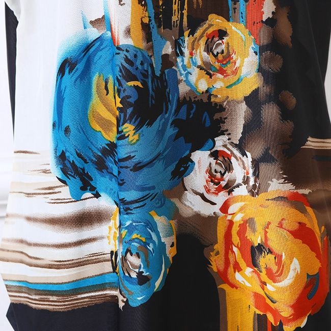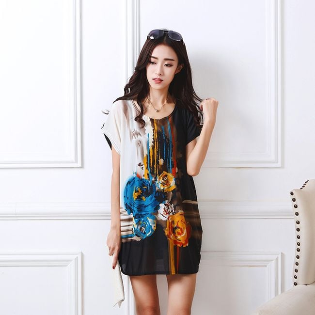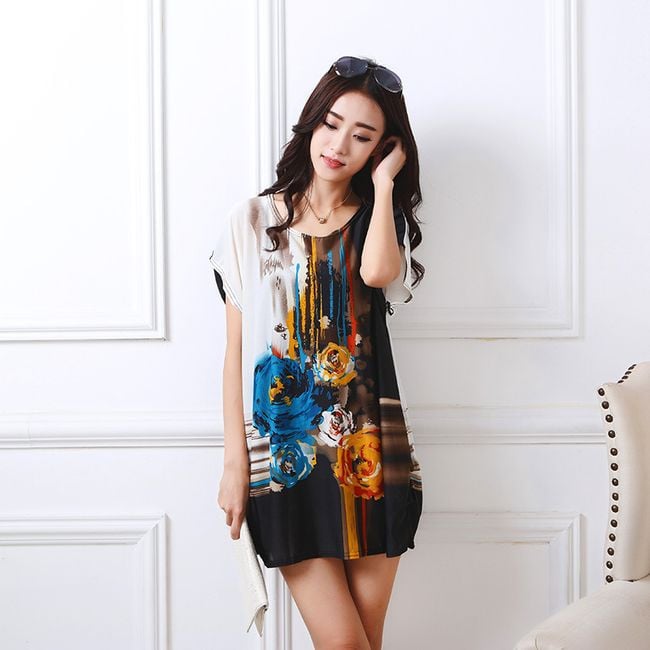 Dlhý top s farebným potlačou bude vyzerať skvele v kombinácii s legínami alebo skinny džínsami.