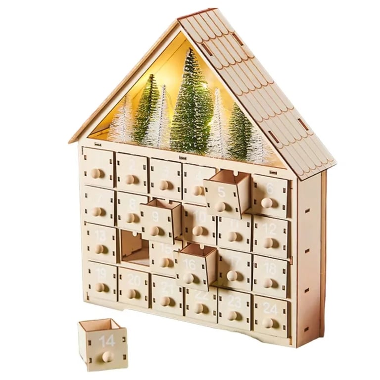 Drevený adventný kalendár v tvare domčeka je originálnym doplnkom pre každú vianočnú domácnosť. Skrýva 24 malých zásuviek, ktoré je možné naplniť sladkosťami, drobnými darčekmi či milými prekvapeniami a spríjemniť tak čakanie na sviatky. LED osvetlenie v hornej časti s mini stromčekmi dodáva kalendáru útulnú atmosféru.
