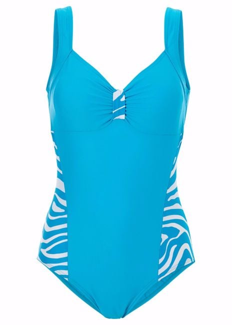 Dámske jednodielne plavky s motívom zebry. V tabuľke veľkostí sú uvedené miery produktu, nie tela.