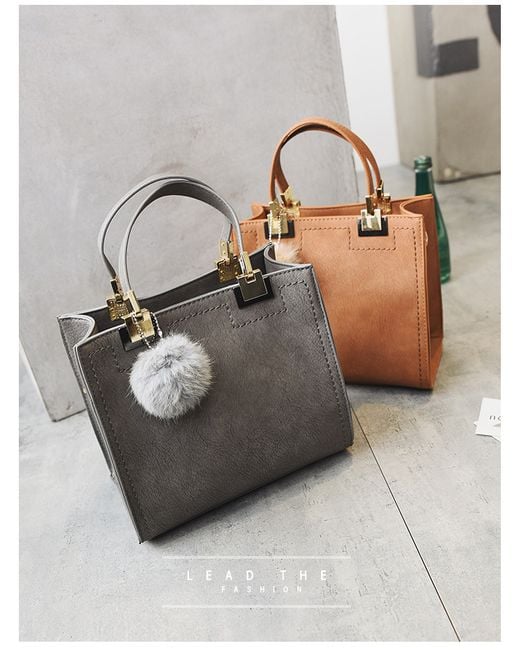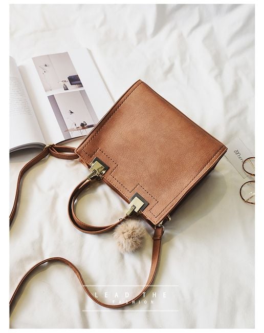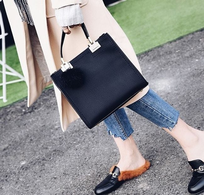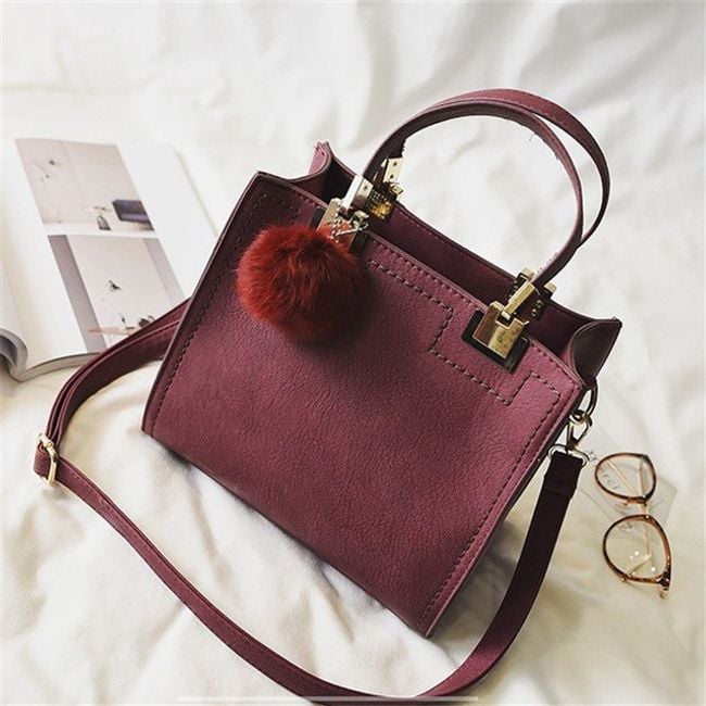 Kabelka z umelej kože je ozdobená príveskom v podobe chlpaté bambule.