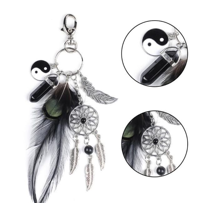 Kľúčenka s karabínou je ozdobená niekoľkými príveskami – zdobí ju lapač snov, pierko, pírko, kryštál aj znak jin jang.