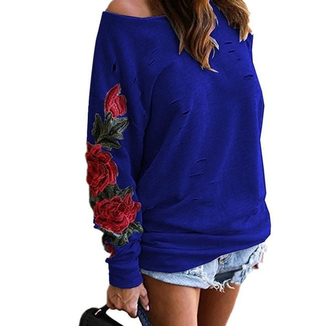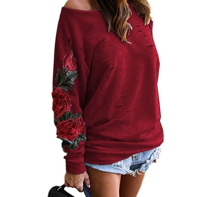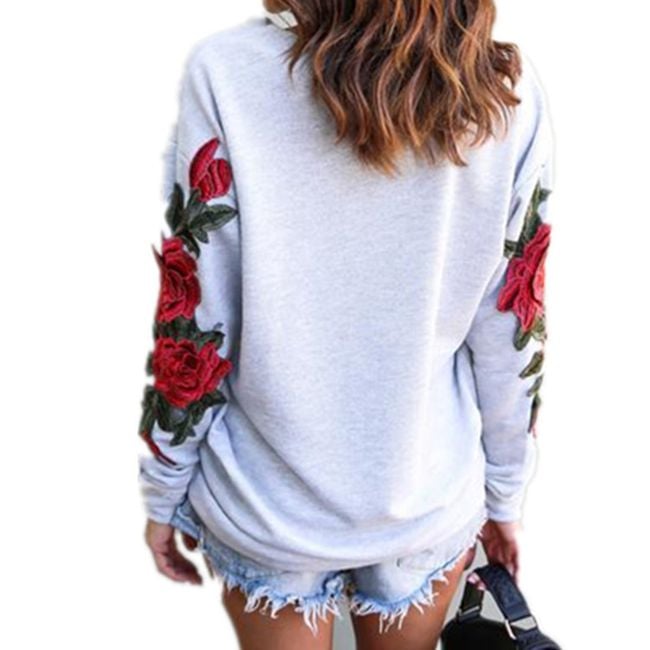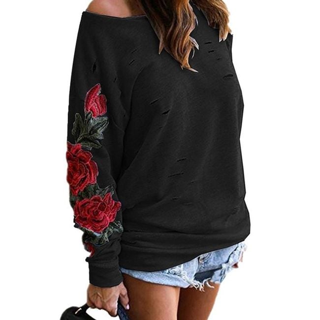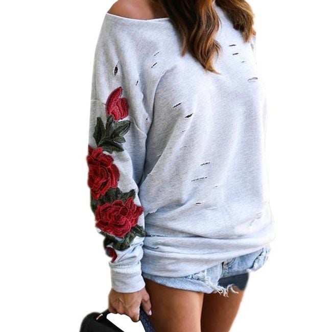 Krásna mikina má motív ruže na každom z rukávov a na prednej strane štýlové trhlinky.