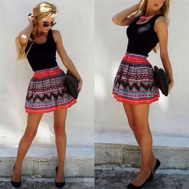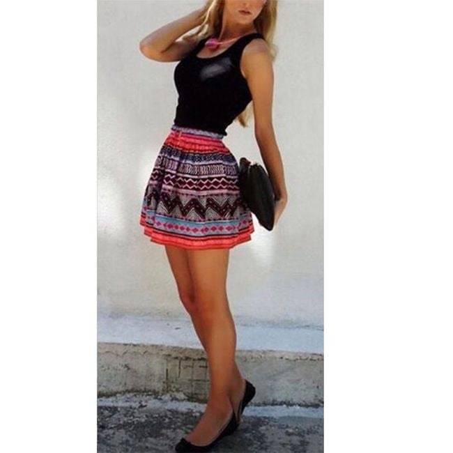 Dámske mini šaty vynikajú svojou štýlovou sukňou so zaujímavo riešeným farebným motívom.