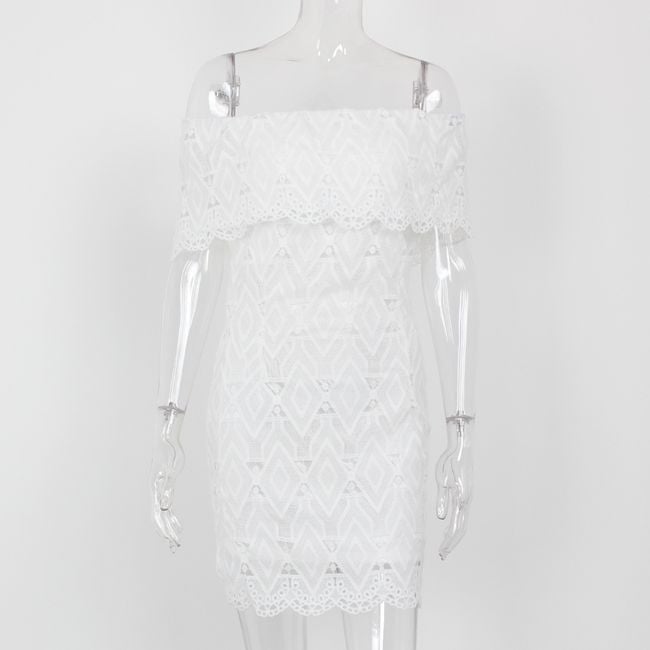 Čipkované letné mini šaty so spadnutými ramenami. V tabuľke veľkostí sú uvedené miery produktu, nie tela.