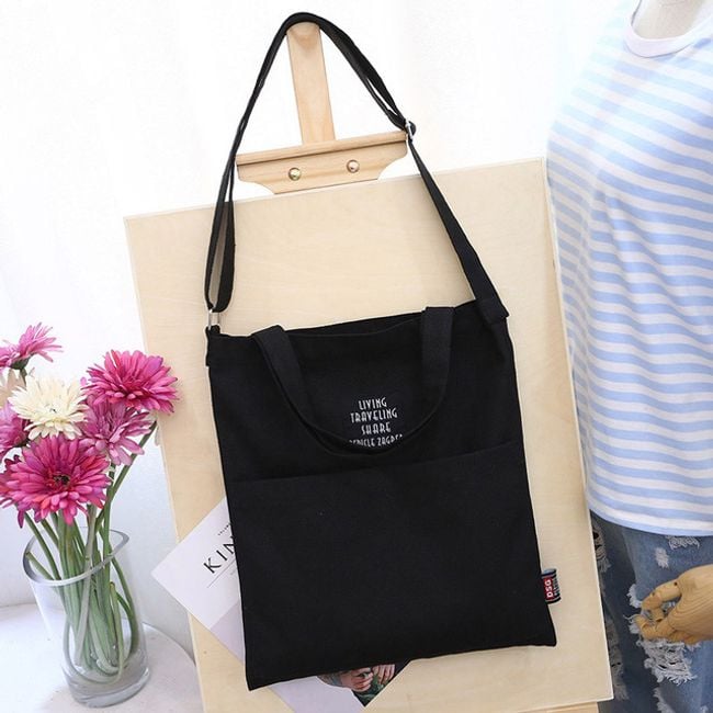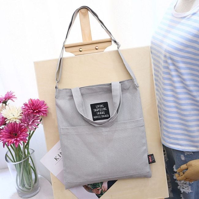 Priestranná plátená taška má dve uši na nosenie v ruke a jeden popruh na nosenie cez rameno. Na výber máte z niekoľkých farieb.