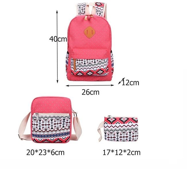 • Rozmery: Batoh – 40 x 26 cm, taška cez rameno – 20 x 23 cm, taštička – 17 x 12 cm