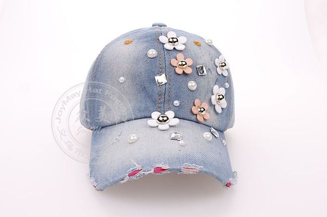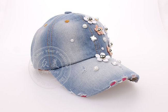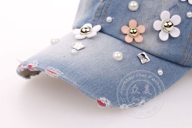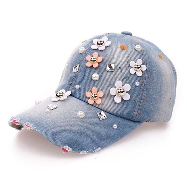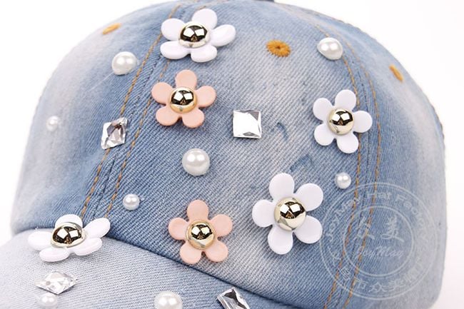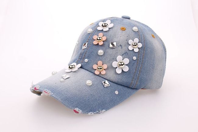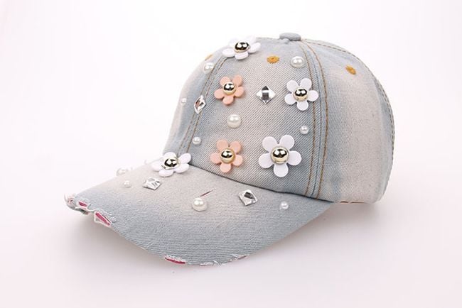 Džínová šiltovka zdobí množstvo kvietkov a umelých perál. Vyberať môžete z dvoch farebných variantov.