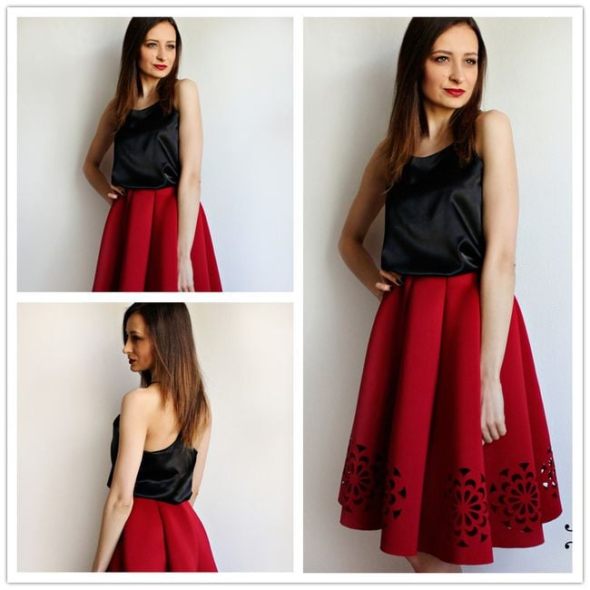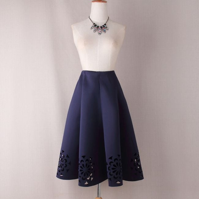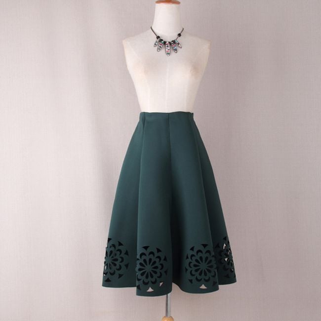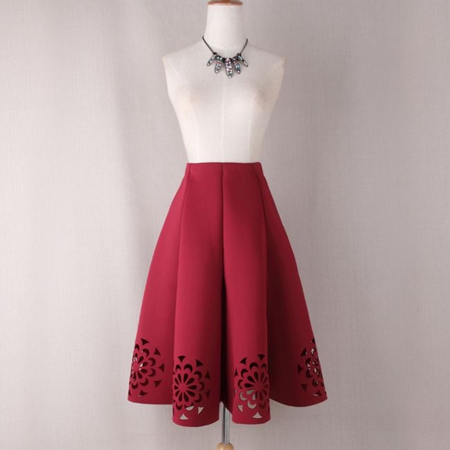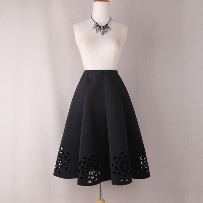 Elegantná skladaná sukňa v jednofarebnom prevedení je zdobená prerezmi v tvare kvetín.