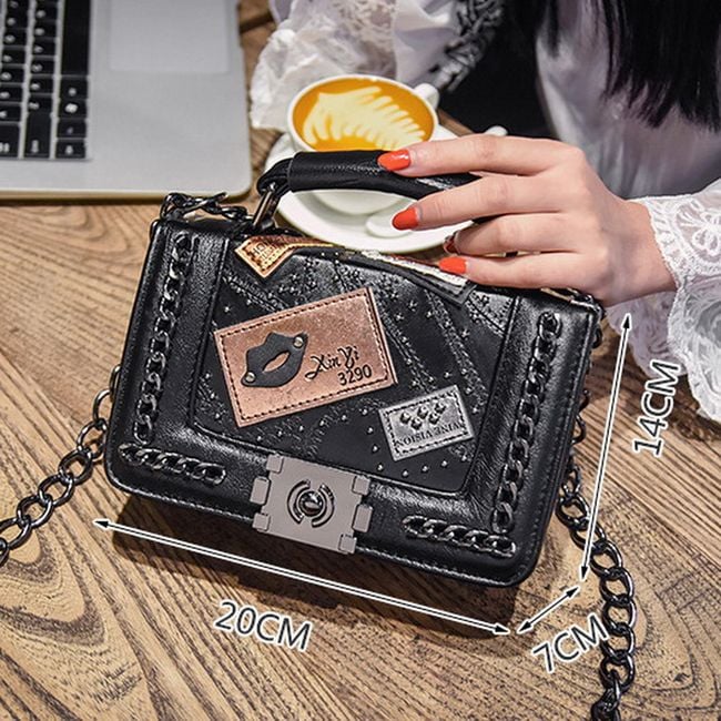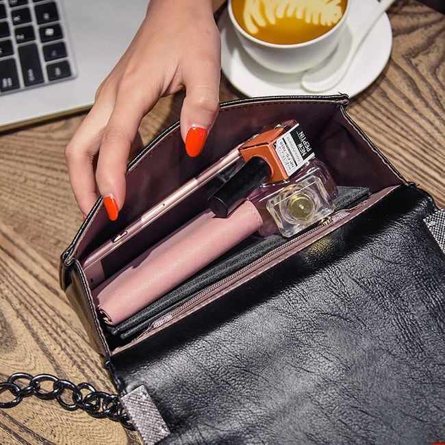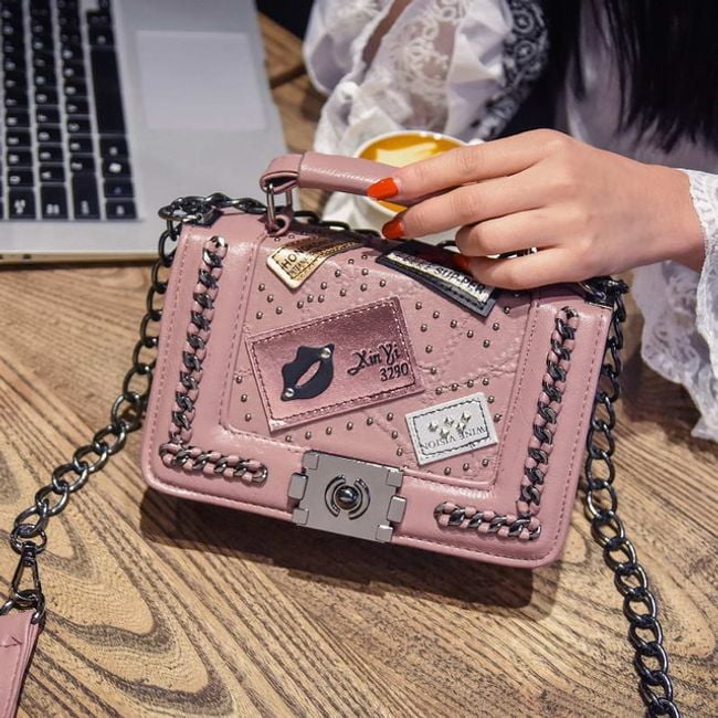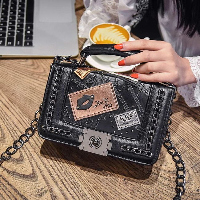 Kabelka je štýlovo zdobená a popruh je tvorený reťazou.