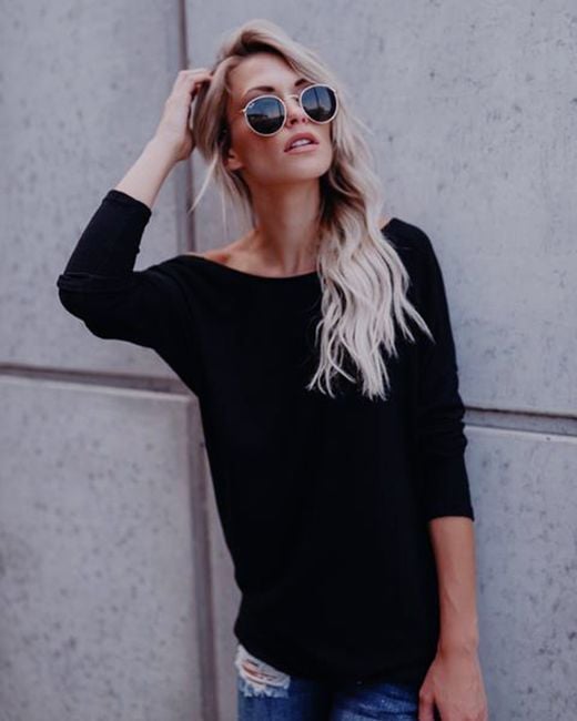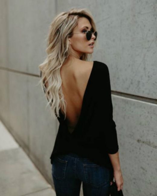 Z prednej strany vyzerá ako tuctové jednofarebné tričko s dlhým rukávom. Stačí sa však otočiť a hlboký výstrih pritiahne pohľady všetkých.