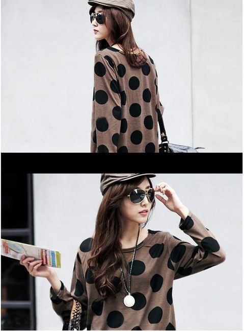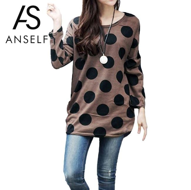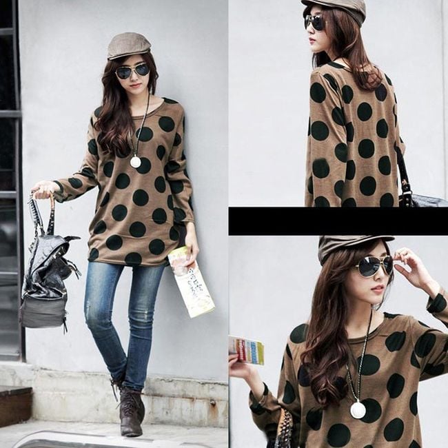 Dámske dlhšie tričko s voľnejším strihom má dlhé rukávy. Hnedá látka je zdobená veľkými čiernymi bodkami. Na výber máte z mnohých veľkostí.